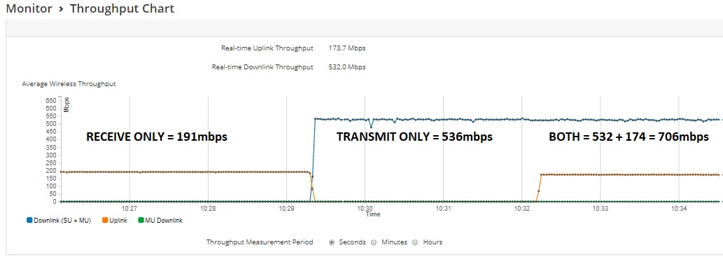 The Upload only test was 191 mbps (25% ratio) The Download only test was 536 mbps (75% ratio) The 'Both' Bi-directional test was 532 + 174 = 706 mbps aggregate
