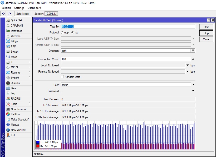 So - first testing in 40Mhz channel widths with 75%/25% ratios, and testing in TCP, using the 'Both' (Bi-Directional at the same time) test. This test was 249 Megabit download and 54 Megabit upload - so an aggregate of 303 Megabit per second in a 40 Mhz channel.