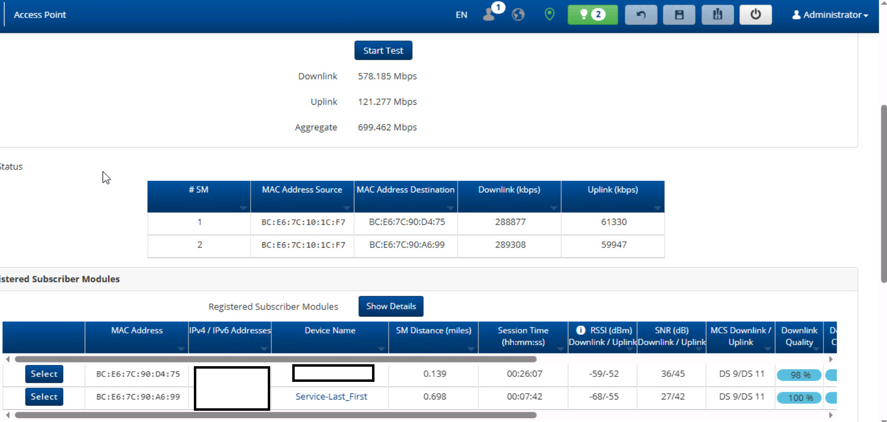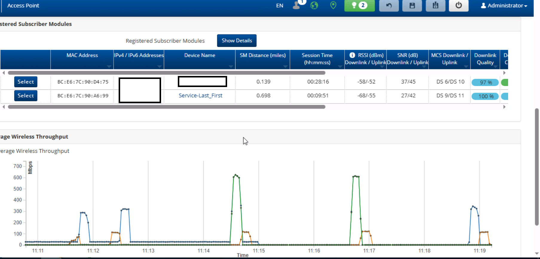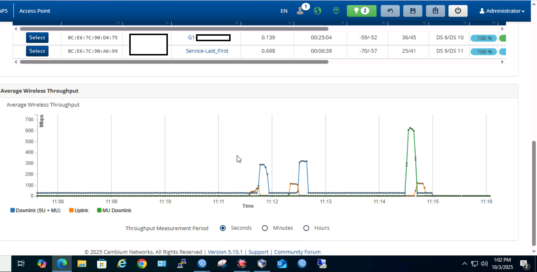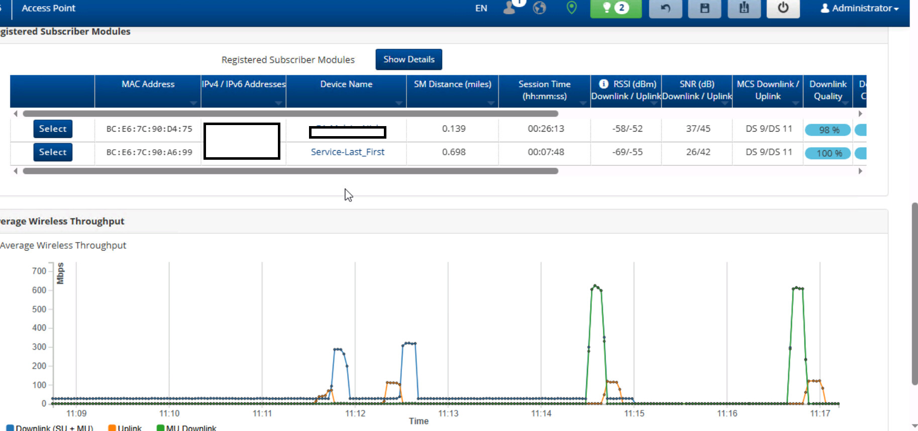 Another confusing thing was Cambium told me that MU-MIMO does not work in Omni mode, but I was able to test and MU-MIMO was working. I know it was working because 2 SM link tests showed AP was pushing 600Mbps at 40mhz and the AP bandwidth charts showed MU-MIMO (green) traffic.