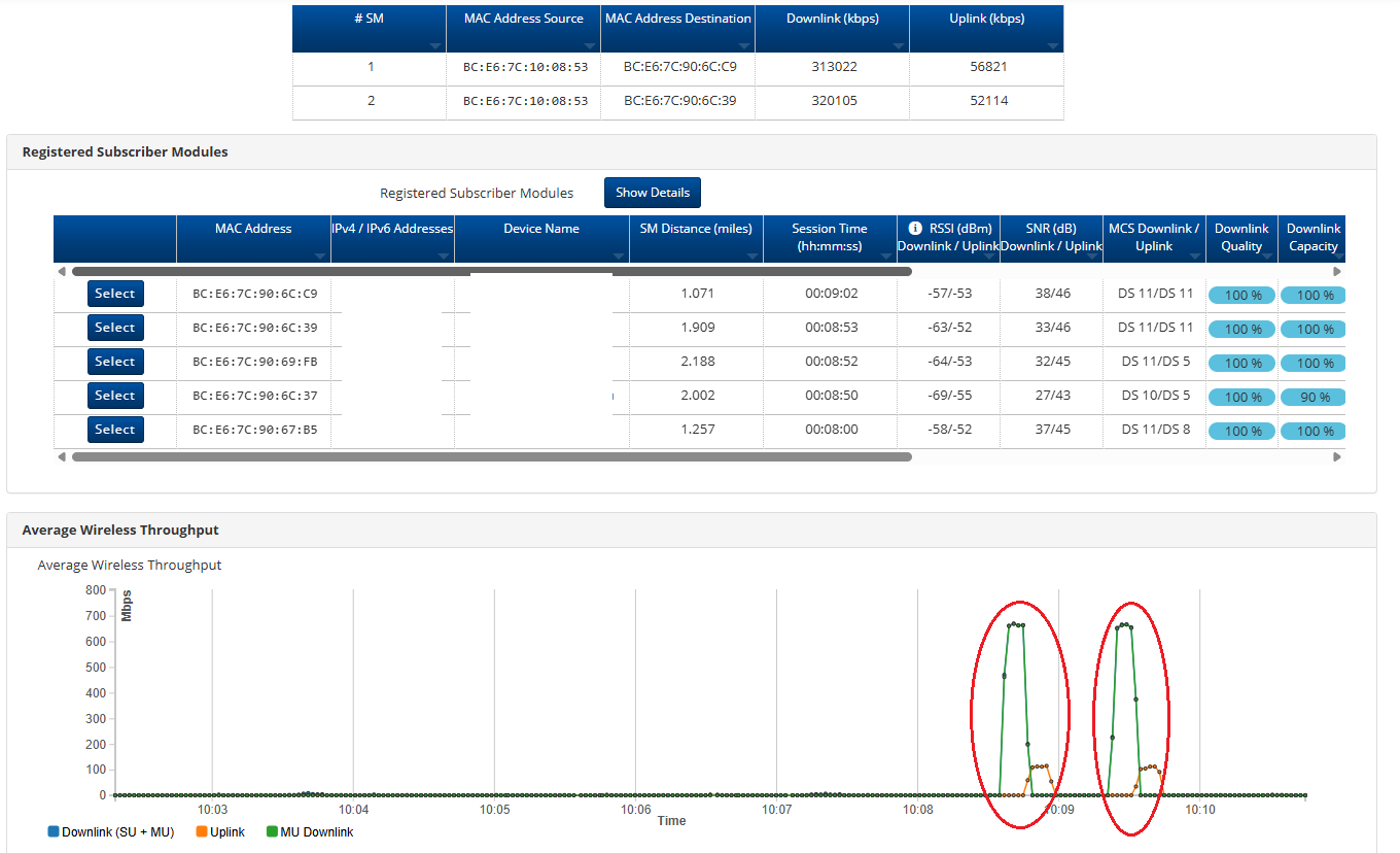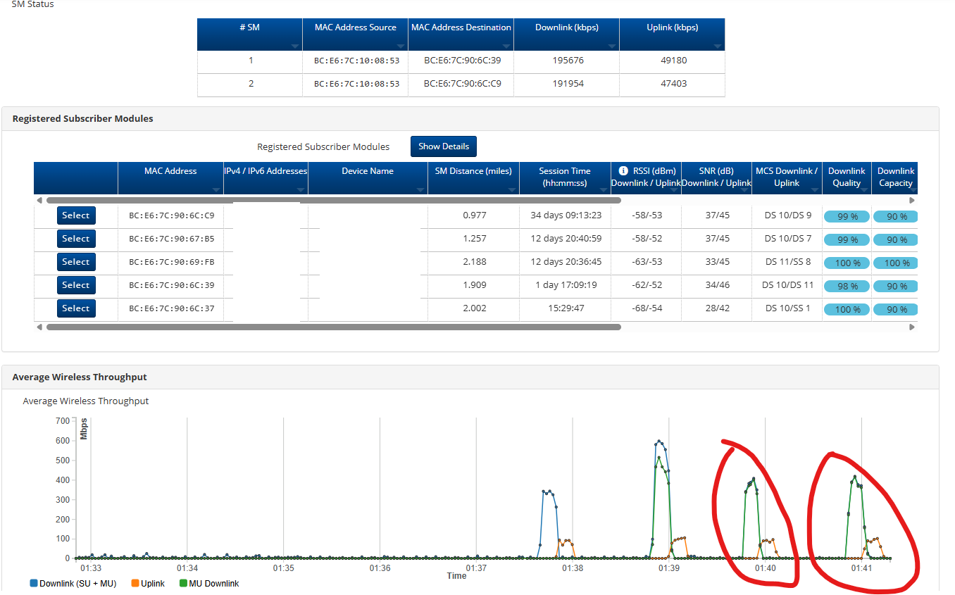 We’ve noticed some strange issues with having MU-MIMO turned on the 4500 8x8 integrated. First off, when MU-MIMO is being used, beamforming gains are nullified, meaning that the 6dB (2-3 increase in modulation levels on downlink) is not available, this means that all the SM’s participating in MU-MIMO are possibly using a lower modulation level. Another consideration is that due to chipset limitations, only 3 groupings are available, despite it being an 8x8 radio. We ended up disabling MU-MIMO and going back to beamforming only and it seems to perform better over time. I think that the ePMP dev team still has room to optimize MU-MIMO and we’ll try again when there’s another major update.