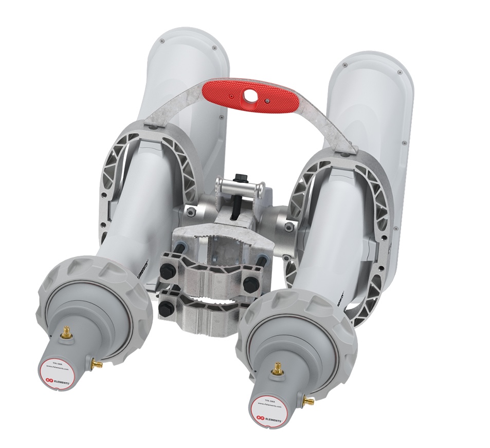 The RF Elements AH60-4x4-SMA horn antenna has both horns pointed in the same direction and wrap around the mast on three sides, requiring a standoff mount and preventing direct mounting to the tower.