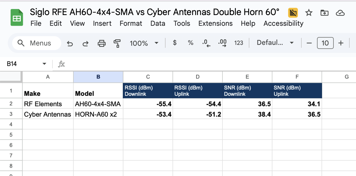 Check the spreadsheet tabs for the full results with screenshots: Siglo RFE AH60-4x4-SMA vs Cyber Antennas Double Horn 60° - Google Sheets