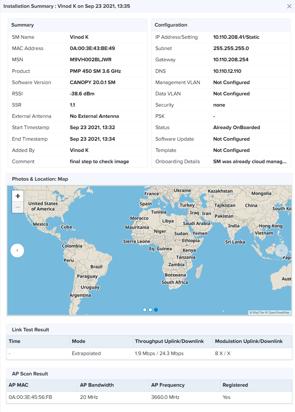 The cnArcher Installation summary of PMP SM is available in cnMaestro Cloud and OnPremises for cnMaestro X users from cnMaestro version 3.1.0. Installation Summary syncs automatically with cnMaestro when network connectivity is detected in Mobile.