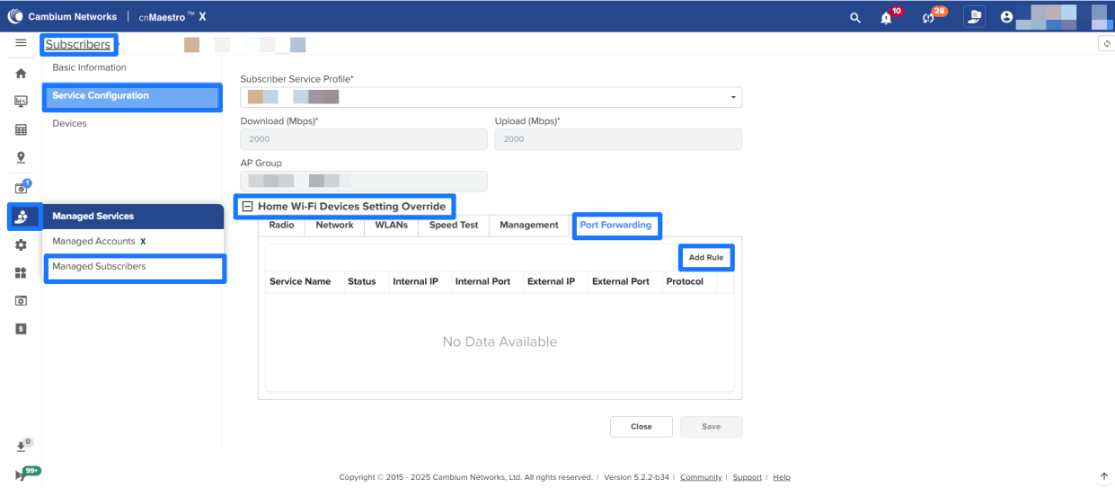 Port forwarding rules can be configured from Subscribers → Service Configuration → Home WiFi Devices Setting Override and RV22 → Configuration → Advanced Settings sections.