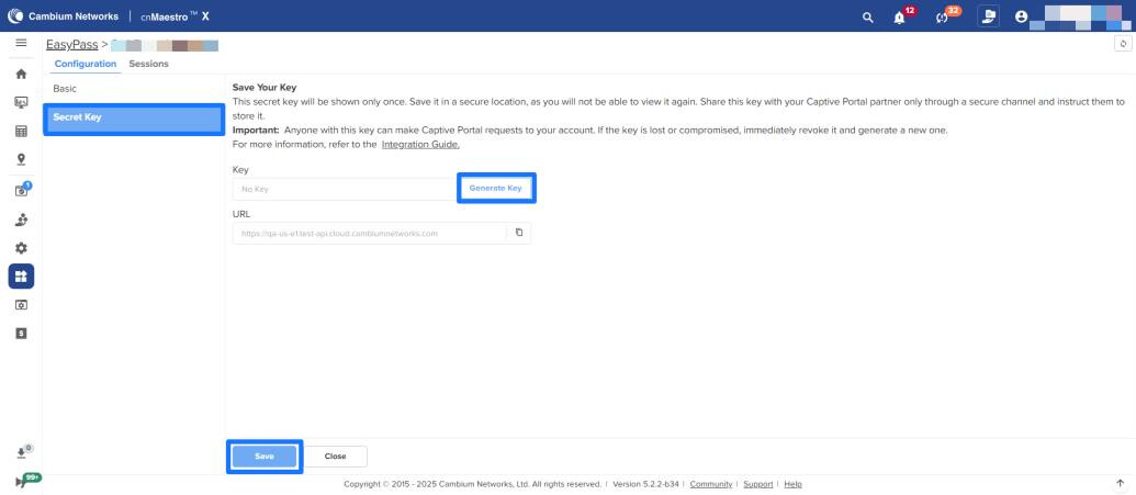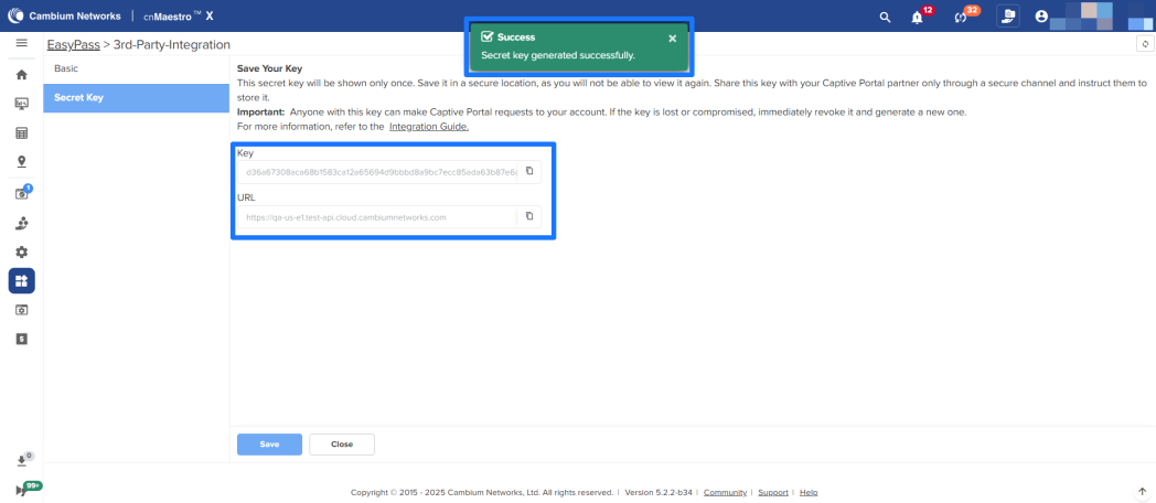 NOTE: This secret key will be displayed only once. Please save it in a secure location, as it cannot be viewed again. Share it with your Captive Portal partner only via a secure channel and advise them to store it safely.