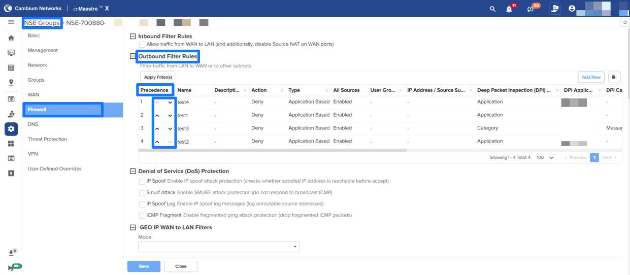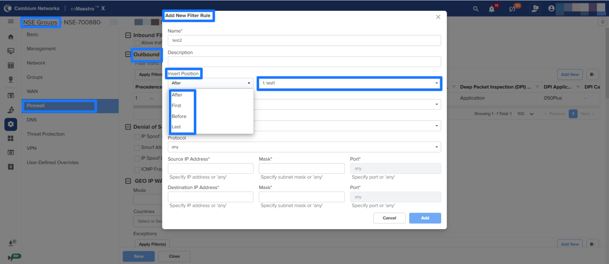 Insert Position field is added for the below WAN and Firewall configuration of NSE Groups, which can place the rules/policies at the configured precedence.