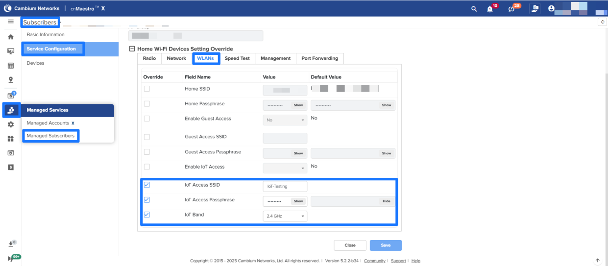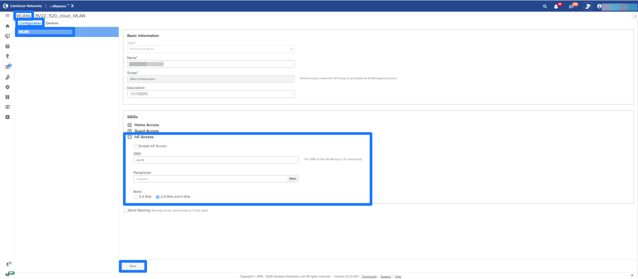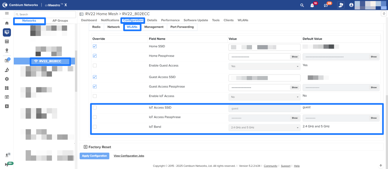 IoT SSID can be configured from WiFi Profiles > WLANs → Configuration → SSIDs, Subscribers → Service Configuration → Home WiFi Devices Setting Override → WLANs and RV22 → Configuration → Advanced Settings