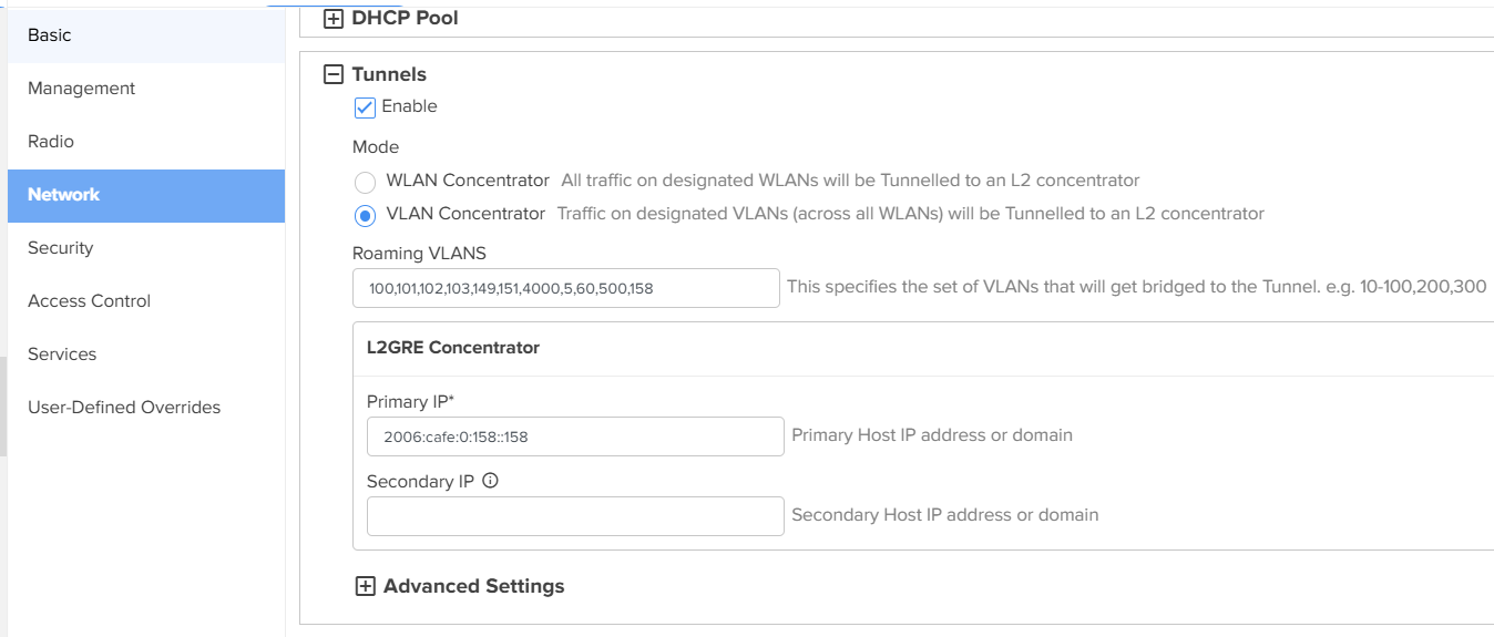VLAN Concentrator mode is currently in the pilot phase with selected customers and will be generally available in an upcoming release. The WLAN concentrator mode continues to be supported exactly as before, except that the UI has been extended to support multiple modes.