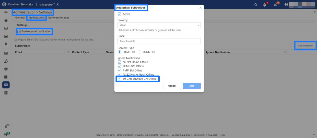 Introduced an option in email notification settings to ignore offline alerts for 60 GHz cnWave Client Nodes (CNs).