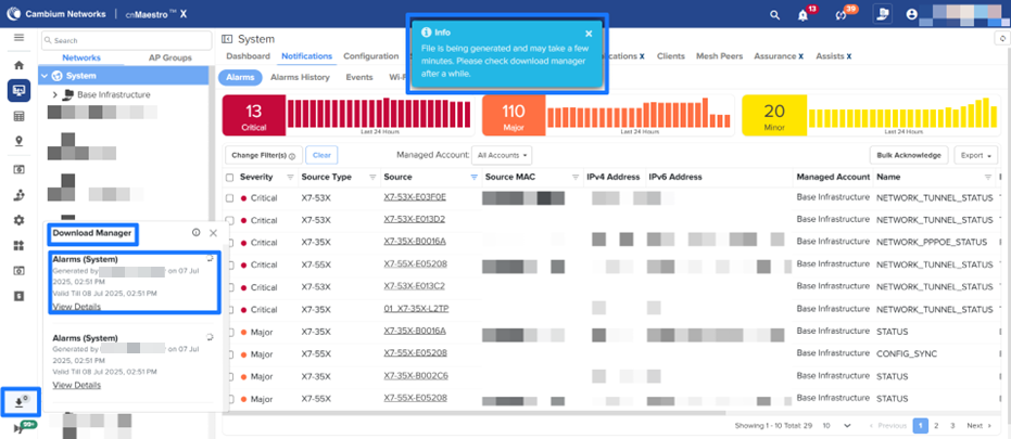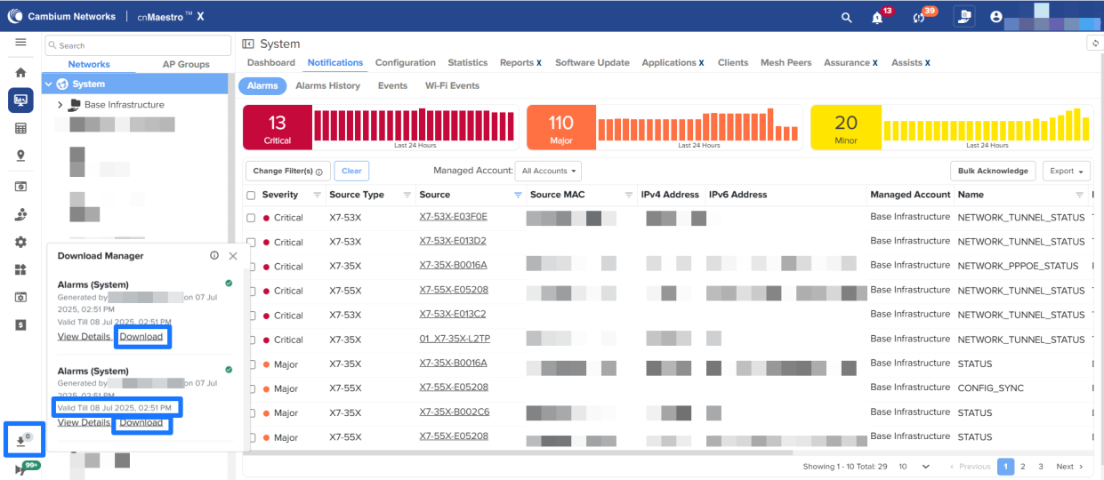 Navigate to System → Notifications → Alarms. You can either download the complete dataset or a specific subset of filtered data.
