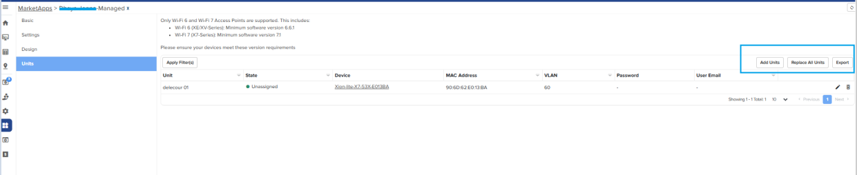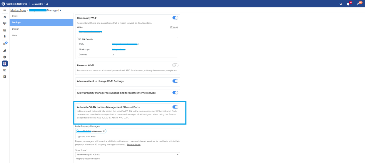 cnMaestro will automatically assign the specified Market app VLAN to the non-management Ethernet port. Each unit entry must have both a unique device name and a unique VLAN assigned when using this feature. Supported devices: XE3-4, XV3-8, XE5-8, XV2-22H. -