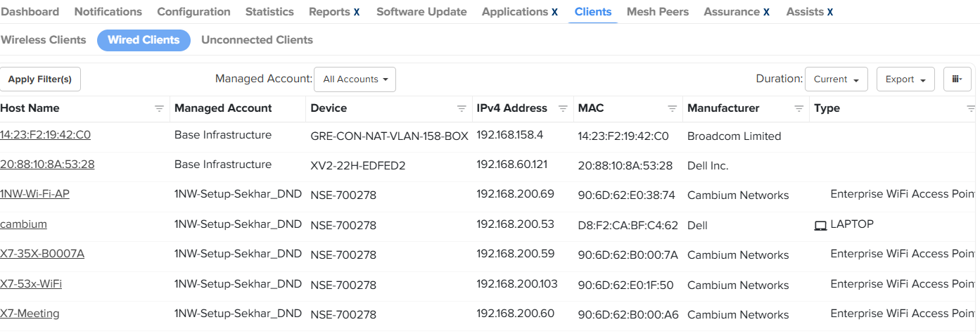 Starting with cnMaestro release 5.2.2, Monitor and Manage → Clients → Wired Clients tab will also display wired clients connected to Wi-Fi 6 access points.