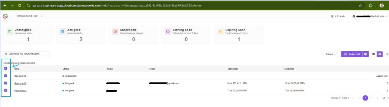 The user can select all units using the Bulk select checkbox located to the left of the table view, as shown in the figure below. Once selected, the Action tab displays bulk operation options such as Send Portal Link, Resume, Suspend, and Terminate. This tab streamlines the process of managing multiple units at a time. -