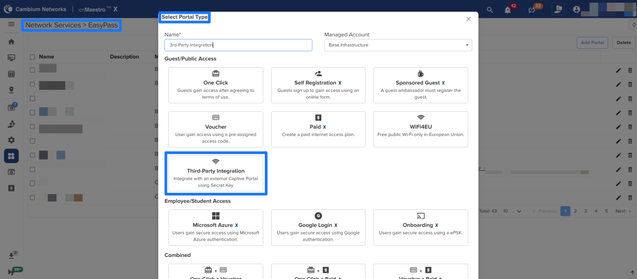 To support third-party captive portal vendors, the new EasyPass portal type, Third-Party Integration is introduced where partners can connect their external captive portals to Cambium Access Points (APs) by posting login and logout requests directly to cnMaestro.