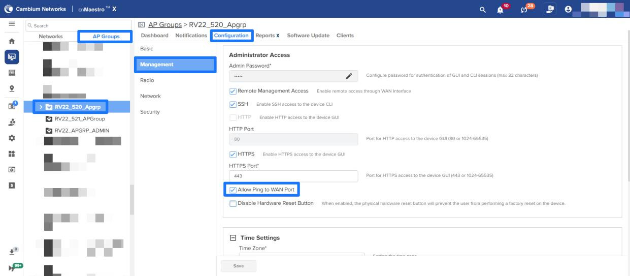 A new option has been added to the AP Groups to allow WAN Port pinging. This option can be enabled/disabled under AP Groups → Configuration → Management section.