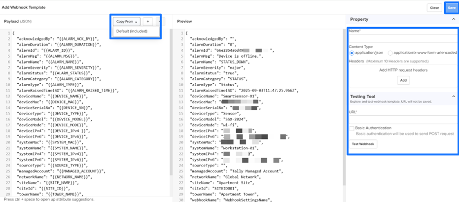 Provide the Webhooks payload template in JSON format in the left window. From the Copy From dropdown list, select Default (Included). The Payload window populates the default JSON payload format. Users can add additional variables by clicking the add attributes (+) icon. The Preview window on the right displays a sample payload output with example values.