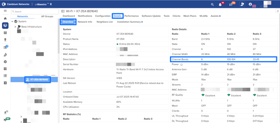 Channel bonding details have been added to the Device Details > Overview page, available for XV, XE, and X7 models.