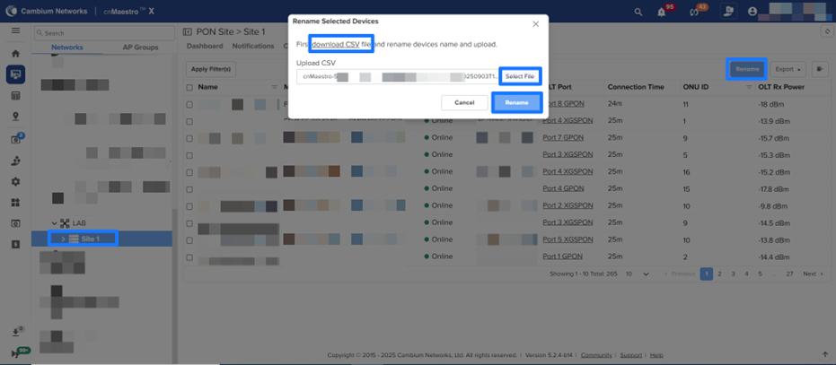 - Download the CSV file, update the device names as required, and then upload the modified file. Click on Rename.