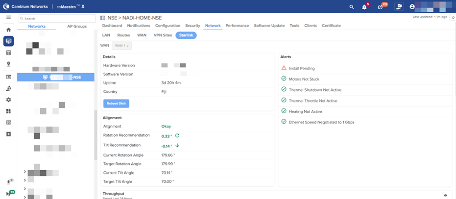 Navigate to NSE > Network > Starlink to monitor Starlink device information, Alignment, and Alerts. Additionally, it is possible to reboot Starlink devices from cnMaestro.