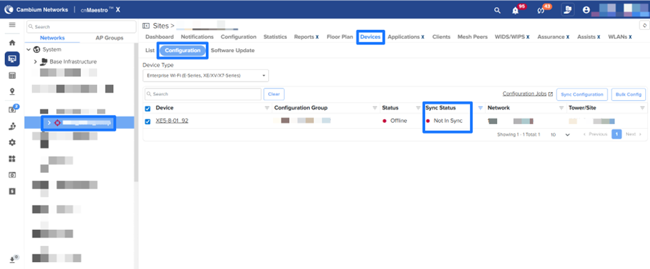 A new KPI has been added to the Site Dashboard that displays the number of enterprise devices currently out of sync. By clicking on the widget, users will be redirected to Site > Devices > Configuration, with the appropriate filter automatically applied.