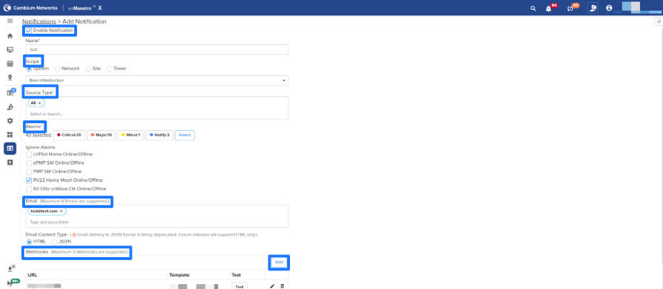 The Notifications feature allows Admin and Super Admin users to configure how cnMaestro sends alert notifications to users.
