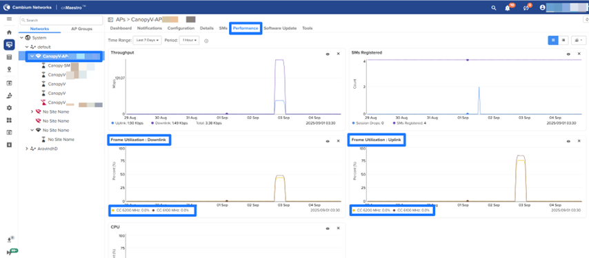 Performance tab > Frame Utilization: Downlink and Uplink graphs