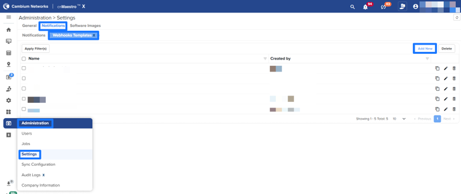 To configure the Webhook template, navigate to Administration > Settings > Notifications > Webhooks Templates X and click Add New