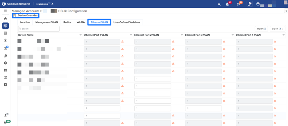 Added Ethernet VLAN configuration under Device Overrides for bulk configuration of Wi-Fi 6 and Wi-Fi 7 APs running version 7.1.1 or later. The management port is read-only, while VLANs for non-management ports can be viewed and dynamically overridden per AP model.