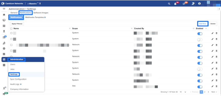 To configure the Notifications, navigate to Administration > Settings > Notifications > Notifications and click Add New.