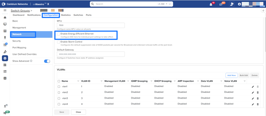 Added support for Energy-Efficient Ethernet configuration in Switch Groups: Within Switch Group > Configuration > Network, Energy-Efficient Ethernet (EEE) must be enabled at the Switch Group level for individual EEE port settings to take effect.