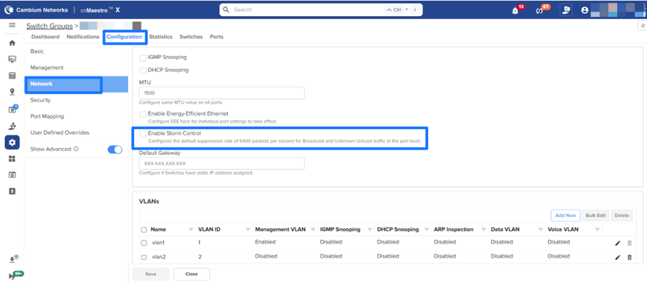 Storm Control Behavior Updates: This release defines consistent Storm Control behavior across Port Mapping and device-level port settings. When enabled, a default suppression rate of 6400 is applied to all ports unless explicitly overridden per port; when disabled, any Port Mapping–configured suppression rates are cleared, while device-level port overrides remain unchanged. Suppression rates configured directly at the port level always take precedence.