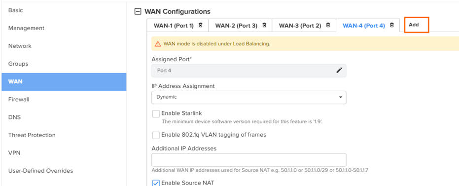 Navigate to NSE Group > WAN to add an additional WAN interface. Click the Add button to ADD a new WAN interface. On NSE4000, you can configure up to 5 WAN interfaces, and on NSE3000, up to 4 WAN interfaces.