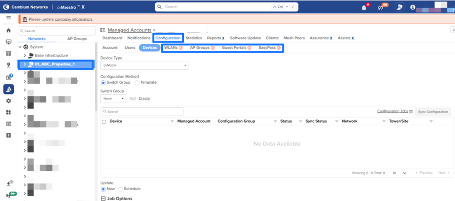 The redundant configuration group tabs—AP Groups, WLANs, Guest Portals, and EasyPass—under Managed Services > Managed Accounts > > Configuration are deprecated and will be removed in the upcoming 6.0 release.