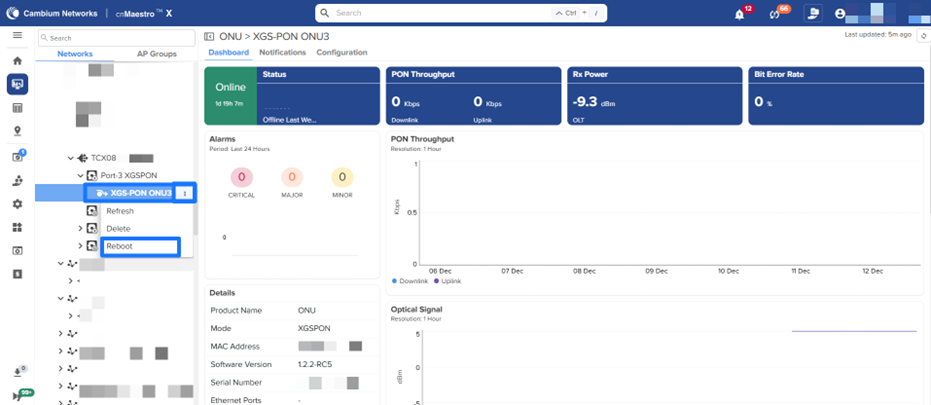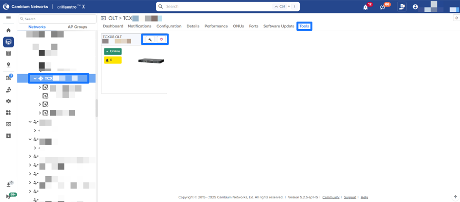 Reboot support has been added for both OLT and ONU devices and Download Tech Support file is now available for OLTs under Tools. This enhancement streamlines troubleshooting workflows and accelerates issue resolution for field teams managing large-scale fiber deployments.