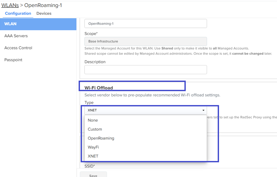 Select an appropriate vendor in the WLANs > Wi-Fi Offloading section.