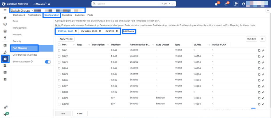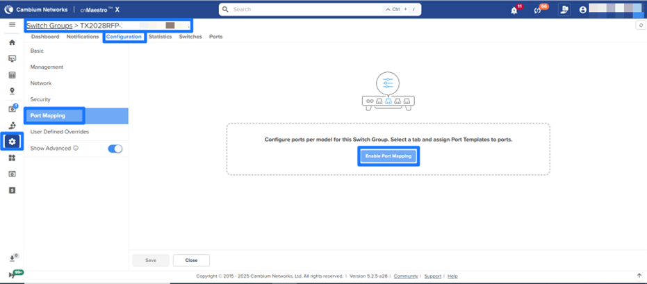 The new Port Mapping feature provides centralized management of port-level settings for different cnMatrix switch models within a Switch Group. Administrators can enable or disable Port Mapping per model and define consistent, model-specific configurations across large or distributed deployments.