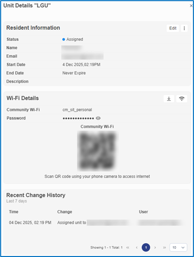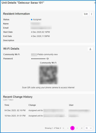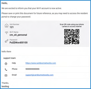The Wi-Fi Front Desk App and Wi-Fi Support App display an additional Wi-Fi Details section. This section displays the Wi-Fi details assigned to the residents, along with the QR code.