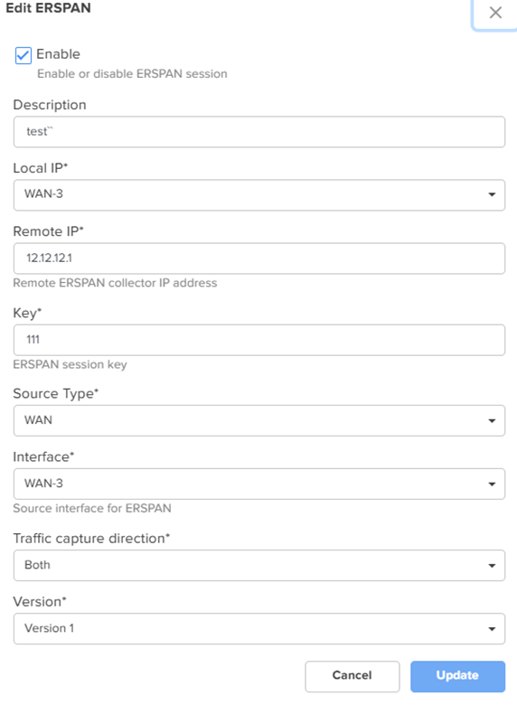The Encapsulated Remote Switch Port Analyzer (ERSPAN) capability to export mirrored traffic to remote analyzers over IP. This feature enables centralized packet capture, intrusion analysis and troubleshooting across distributed sites without requiring a direct switch-level tap.