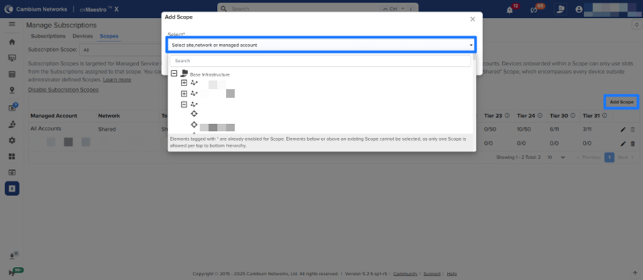 Subscriptions can be allocated at the Managed Account, Network, or Site levels. All subscriptions initially reside in a shared pool; after scoping is enabled, administrators can assign subscription pools to specific scopes. Devices that are onboarded within a scope can only use the subscriptions allocated to that scope.