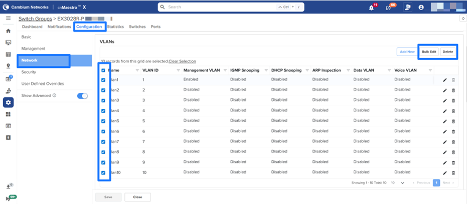 Bulk Edit and Delete options are added for VLAN section under Switch Groups > Configuration > Network