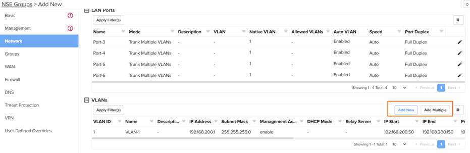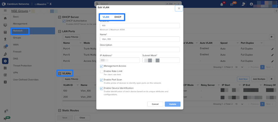 Separate VLAN and DHCP tabs have been added to the Add/Edit VLAN workflow in the NSE Groups > Network > VLANs section to improve configuration.