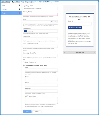 The Design tab in Outdoor Hospitality MarketApps allows you to customize the branding and appearance of the front desk and resident portals, ensuring a cohesive and professional user experience.