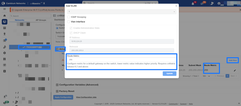 Default Gateway Metric Configuration: Administrators can now configure a metric for the default gateway on cnMatrix switches under Advanced Settings > VLAN, where a lower metric value indicates higher priority. This feature is supported on cnMatrix devices running software version 6.2.0 or later.