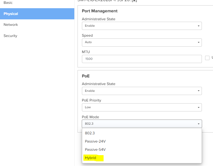 we have to disable and enable the port to power up the AP everytime this happen (even before, but in a while this step is not helping anymore. we have to ask hotel people to change the cable port at the switch which suddenly a few ports is not working). so we try & error on the port power to hybrid. and the step to disable & enable the port works to power up the AP.