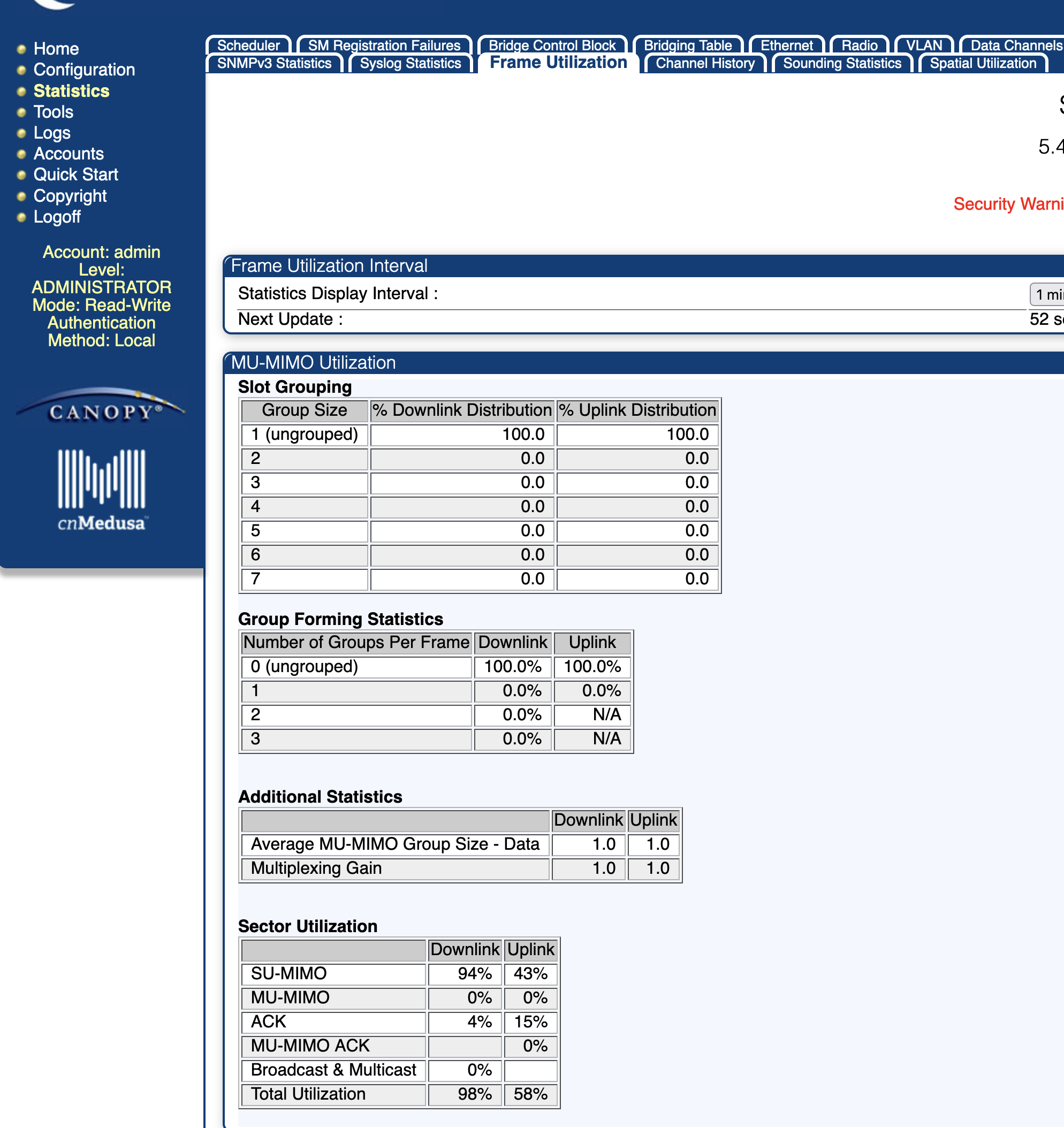 If you run a Link Test to all clients, does it return back the grouping %'s at the bottom of the page? If you look at the Link Status page showing all the SM’s, is it showing MU-MIMO modulations for the SM’s? If you look at Statistics → Sounding Statistics does it show some or all of the SM’s in a “TRACKING” state?