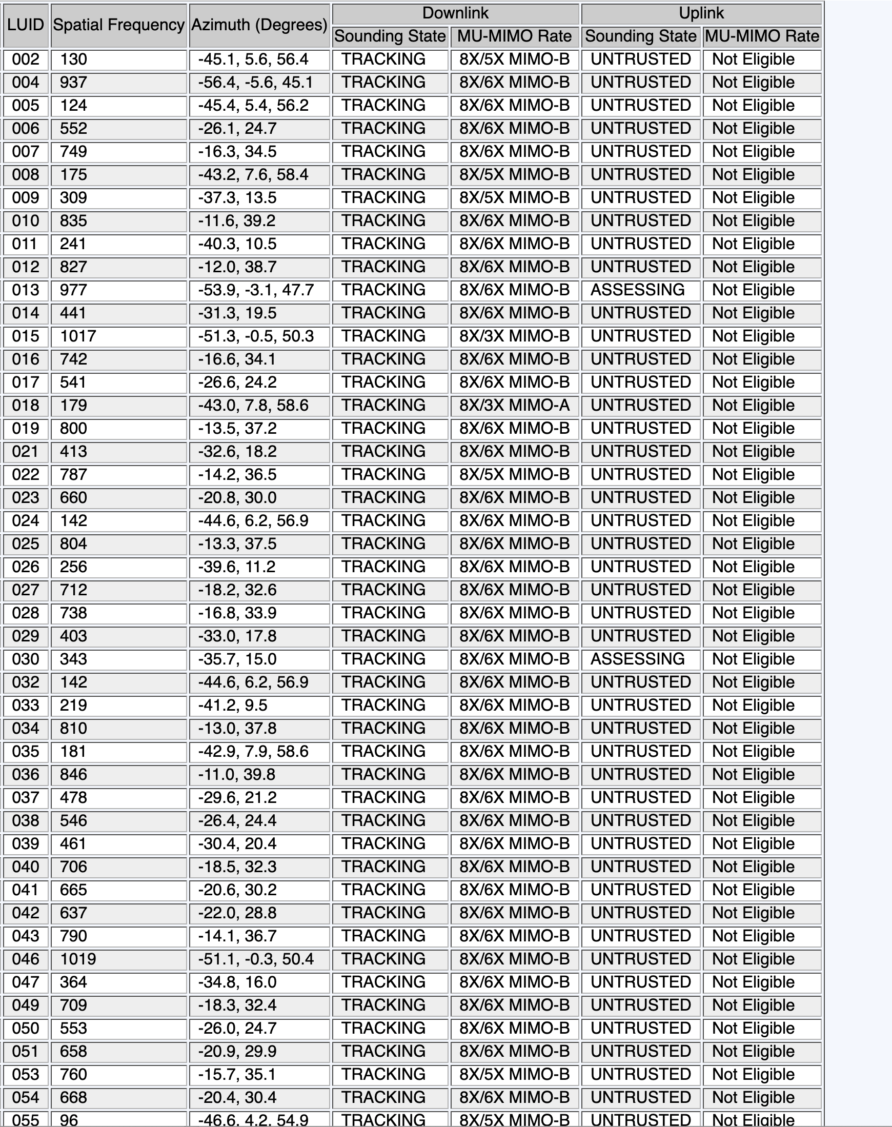Sounding stats is interesting though - stating UNTRUSTED on the Sounding State and both downlink and uplink on the subscribers not eligible in Mu-Mimo. Not seen this before. SM’s on v22.02. Trying SM’s on 22.1 beta 3 and will update. Have you seen this before?
