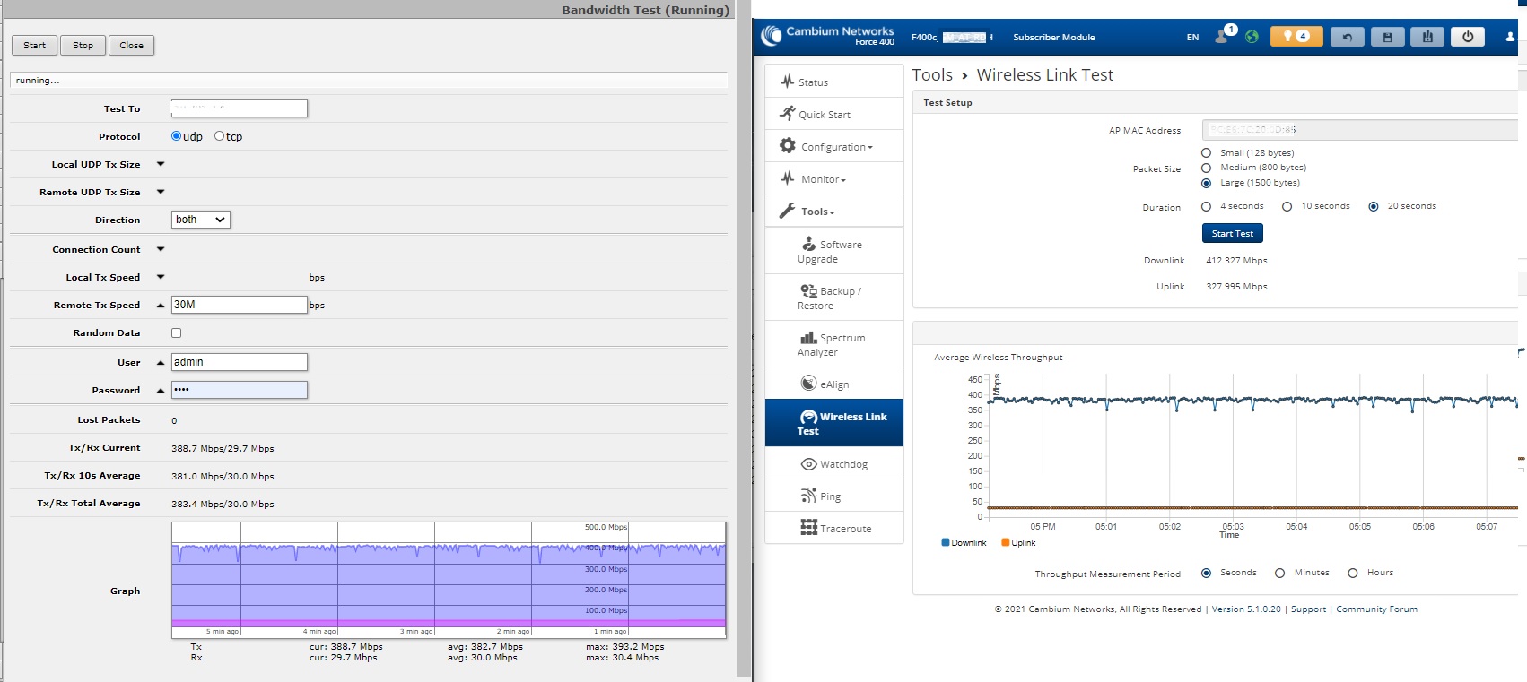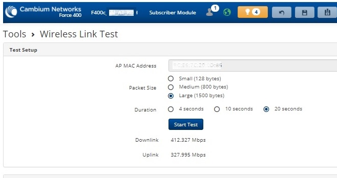 I’ve also tested another link at 15KM in a Rural area with a pair of F400csm (connectorized) paired with 30 dB antennas, and very impressive performance there too. I’ll hopefully have time to post all those performance tests next week.