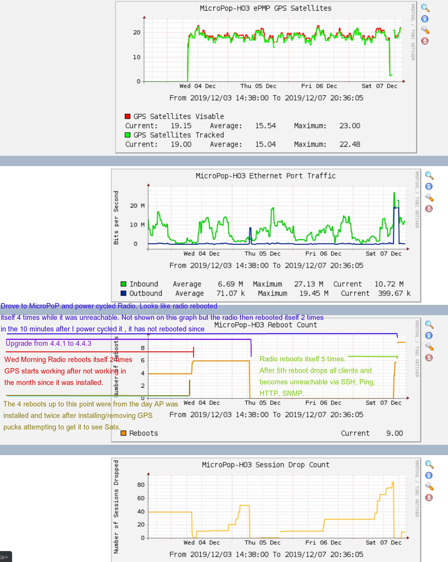 I don't know if this is useful info or not but last night the AP in question appears to have rebooted it itself several times and then dropped all clients and stopped responding to HTTP, SSH, ICMP and SNMP. When I arrived at the site to power cycle the radio all the lights on it were on and ethernet was flashing furiously. Power Cycling the radio fixed it but according to the graphs the radio rebooted itself at least twice in the 10 minutes or so after I power cycled it (that was a bit over 12 hours ago and it has not rebooted since). So this morning I looked at the graphs just out of curiosity. I noticed that while we had not rebooted the radio the day the GPS started seeing Sats , it had rebooted itself several time. It also rebooted itself a few times just before it went dark last night.