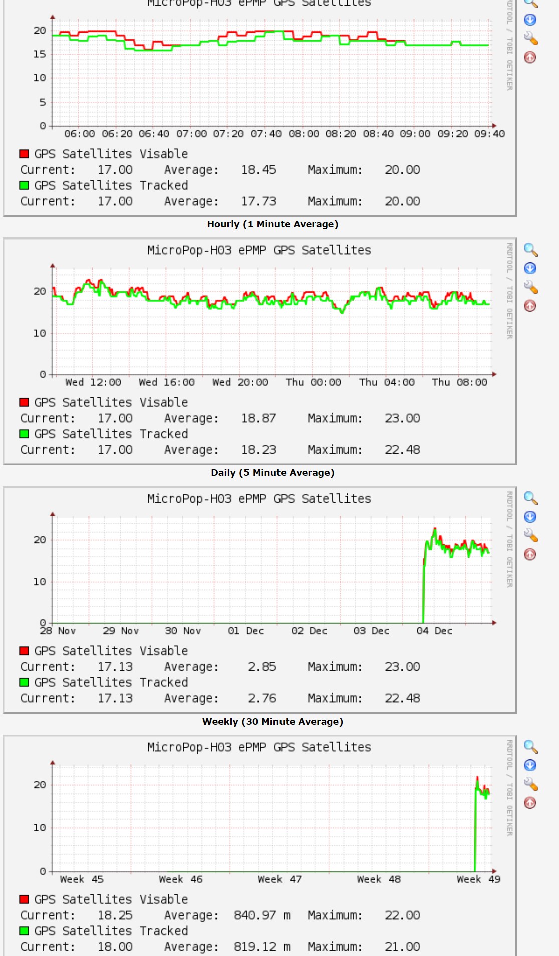 But ! I went and looked at cacti to confirm that it didn't start seeing sats until I upgraded it this morning and ... well the graphs show that in the entire time since it was installed a month ago it had never seen a single Sat until, yesterday morning at 8:30am when it just suddenly started seeing 17 to 23 sats. I didn't upgrade the software until this morning and I heven't touched that site in almost a month, no one touched it yesterday, there was no reboots, nothing to explain why it just suddenly started seeing sats yesterday morning...