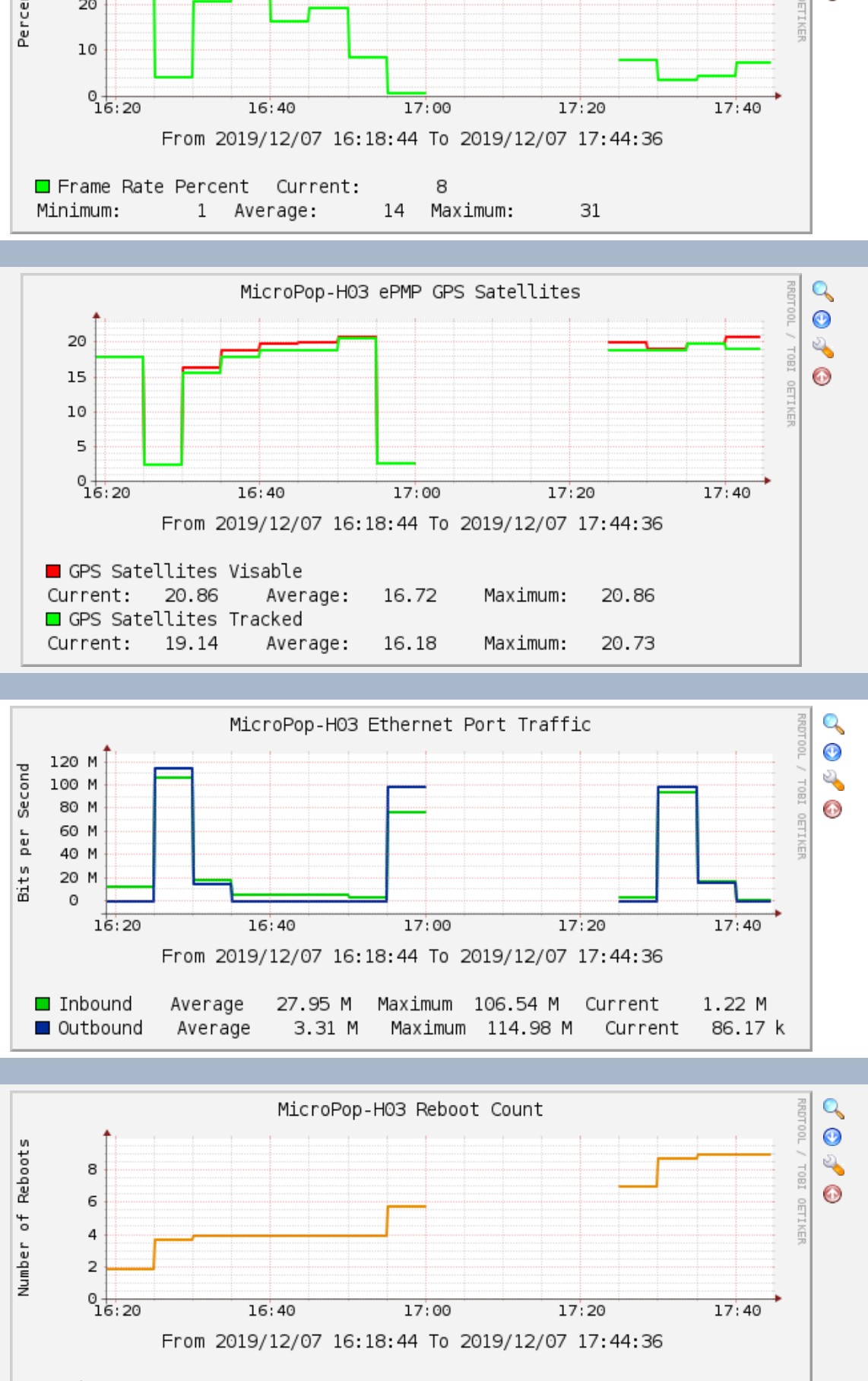 Also note in the 2nd pic I attached. I zoomed in so the ethernet traffic is a 5 min average. I don't know if this is symptom of the reboots or a glitch in the graphing but I've noticed this in/out spike that coincides with the radios rebooting themselves on customer radios when we had to replace them because they kept randomly rebooting. I do not see these spikes when I reboot or power cycle the radio, only when the radios are randomly rebooting themselves. However there are also normally a huge number of ethernet port errors and there was none on this AP so maybe the spike is just a glitch in the graph caused by the reboot.